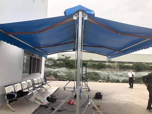 Mái hiên gấp xếp di động: Thiết kế dạng gấp xếp, dễ tháo lắp, phù hợp cho các khu chợ, quán ăn, sự kiện ngoài trời.